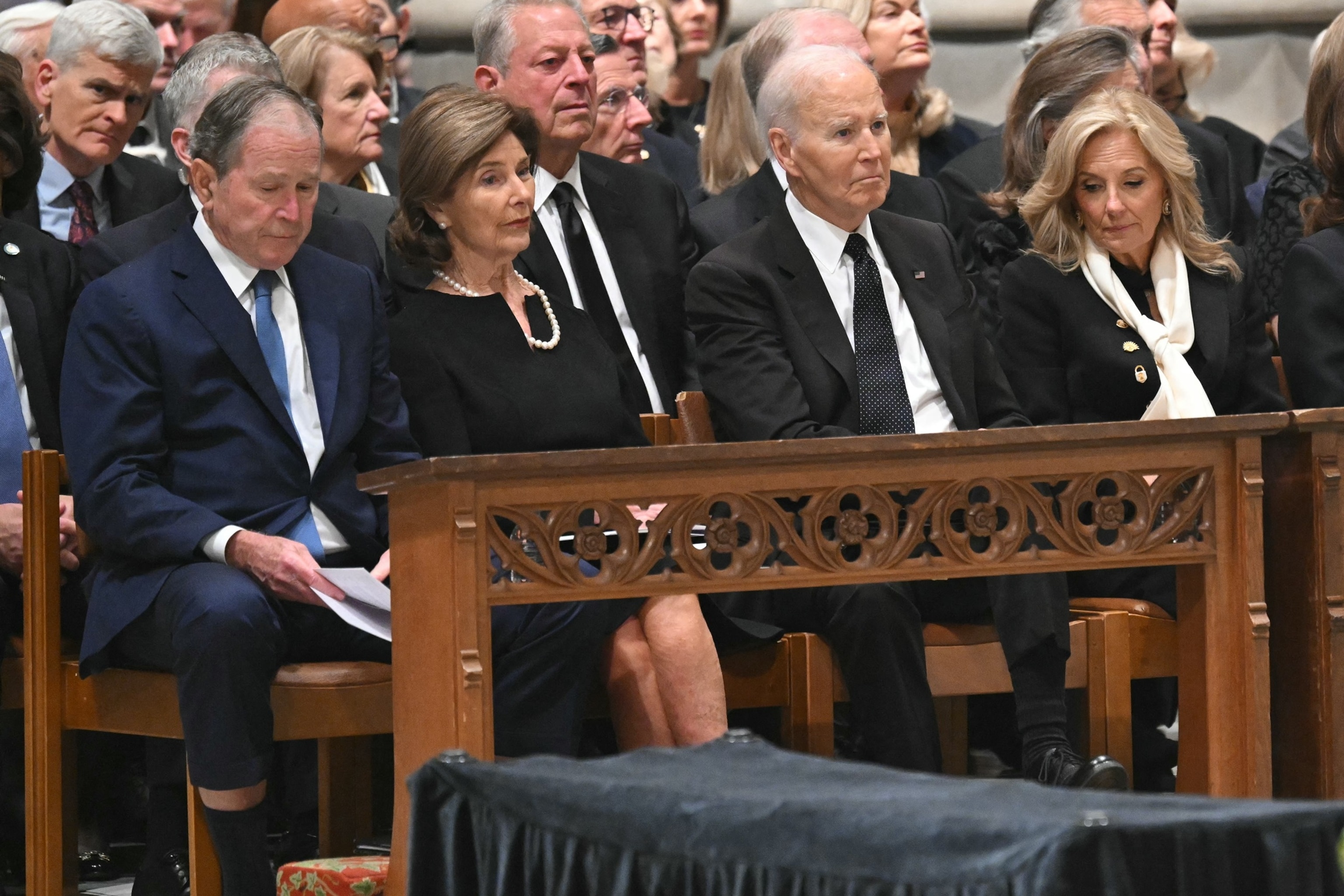 Former President George W. Bush his spouse Laura Bush, former President Joe Biden, his spouse Jill Biden attend the funeral service for late Vice President Dick Cheney on the Washington Nationwide Cathedral in Washington, November 20, 2025.