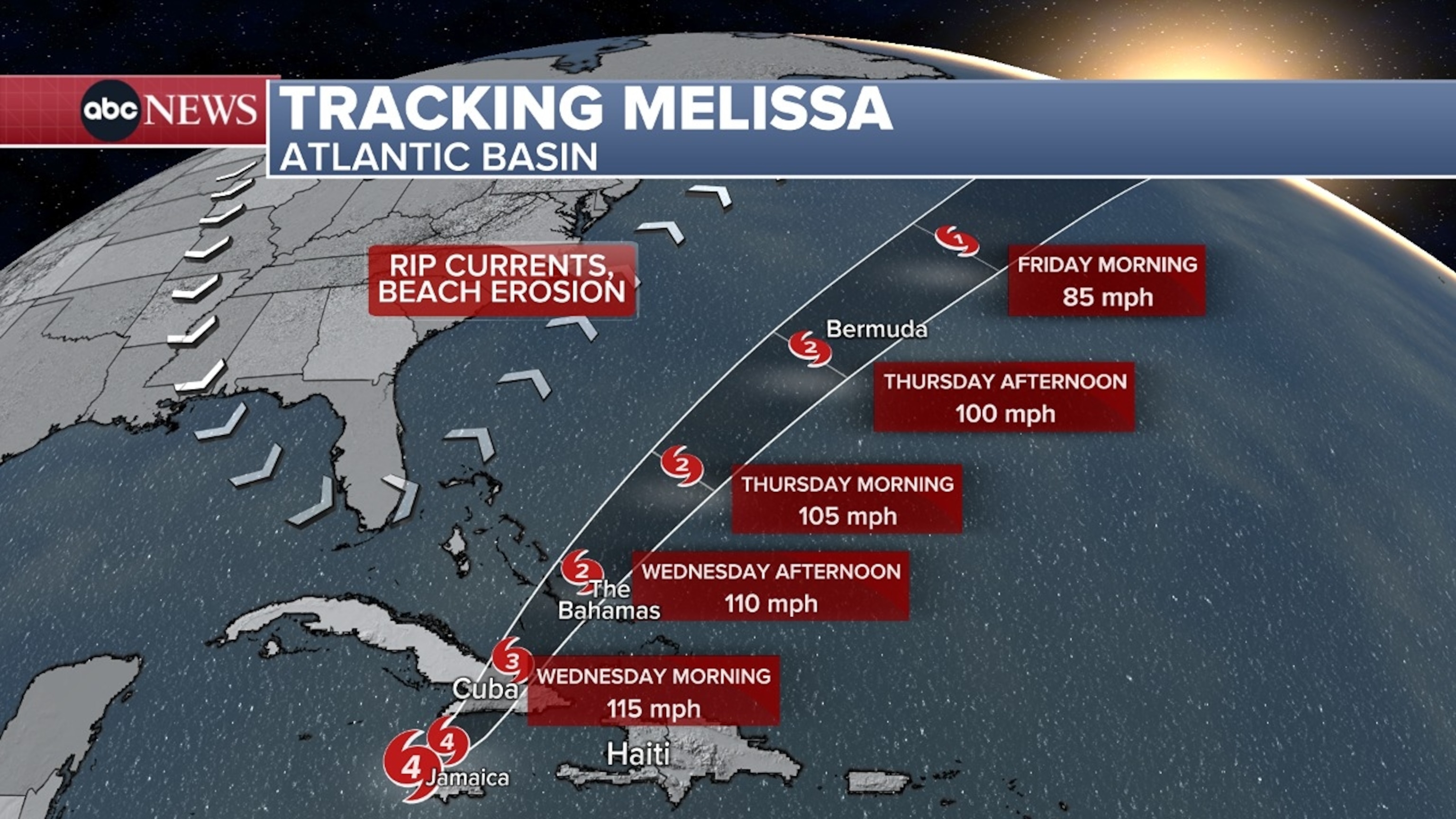 This ABC Information graphic exhibits the forecast for Hurricane Melissa as of Oct. 28, 2025.
