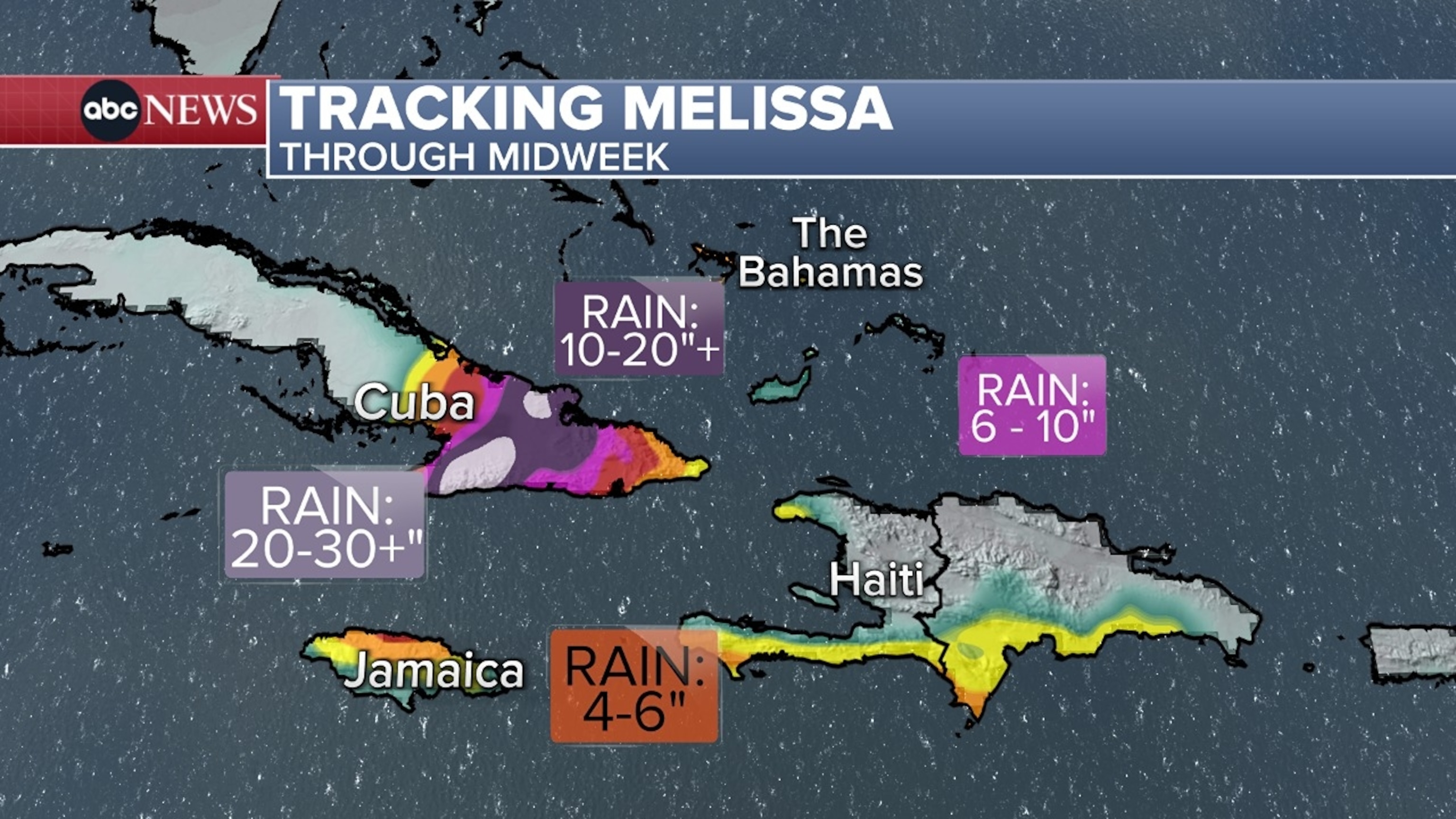 This ABC Information graphic exhibits the forecasted impacts of Hurricane Melissa as of Oct. 28, 2025.